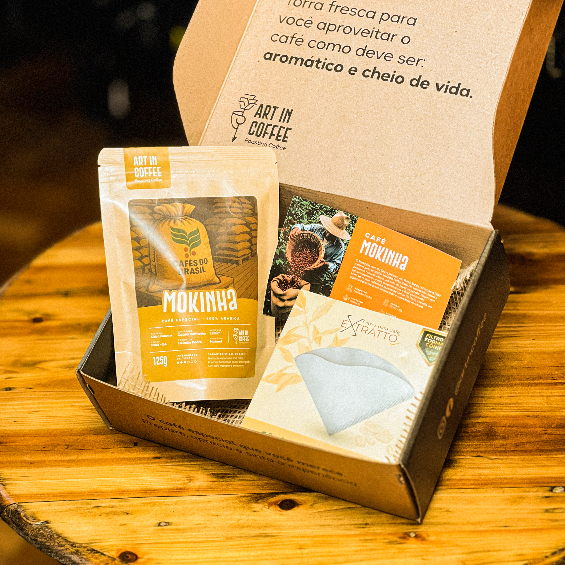 Criado para quem valoriza o preparo do café em sua forma mais pura. O café especial de 125g, escolhido pelo cliente, acompanha uma caixa de filtros cônicos que facilita um preparo consistente, prático e cheio de aroma. Tudo reunido em uma embalagem que já nasce pronta para presentear.